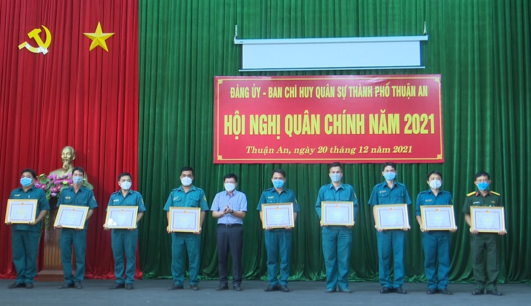 Ban CHQS thành phố chủ động phối hợp với các ban ngành đoàn thể triển khai có hiệu quả công tác phòng, chống dịch Covid-19. Huy động 1.199 đồng chí dân quân thường trực, dân quân cơ động, dân quân tại chỗ, dân quân tự vệ và 1.676 lực lượng tăng cường từ 8 đầu mối đơn vị Quân đội hỗ trợ Thuận An phòng, chống dịch. Thành lập 4 kho dự trữ lương thực, thực phẩm thiết yếu để cấp phát cho các hộ dân với số lượng hơn 4.405 tấn gạo, gần 1.400.000 gói lương thực thực phẩm, hàng thiết yếu cấp phát cho người dân. Phối hợp các đơn vị, tập đoàn, doanh nghiệp tặng 6.675 phần quà cho Nhân dân khó khăn cùng chung tay đẩy lùi dịch bệnh, với tổng giá trị trên 7,7 tỷ đồng...