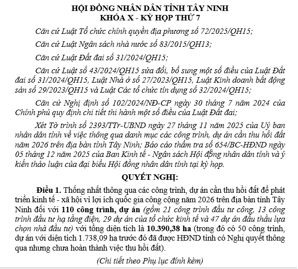 Sáng 10/12, tại Kỳ họp thứ 7 (kỳ họp thường lệ cuối năm 2025), HĐND tỉnh Tây Ninh khóa X, nhiệm kỳ 2021-2026 đã biểu quyết thông qua Nghị quyết về danh mục các công trình, dự án cần thu hồi đất năm 2026 để phát triển kinh tế – xã hội vì lợi ích quốc gia, công cộng.