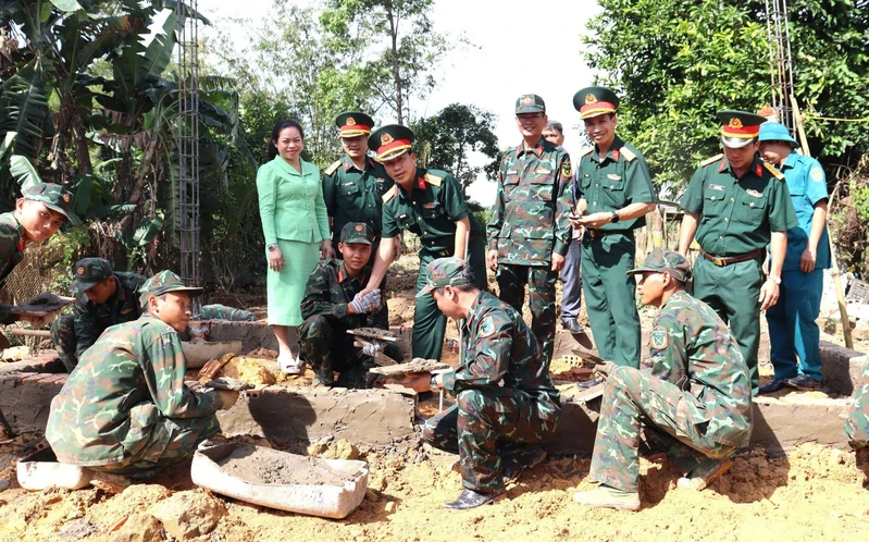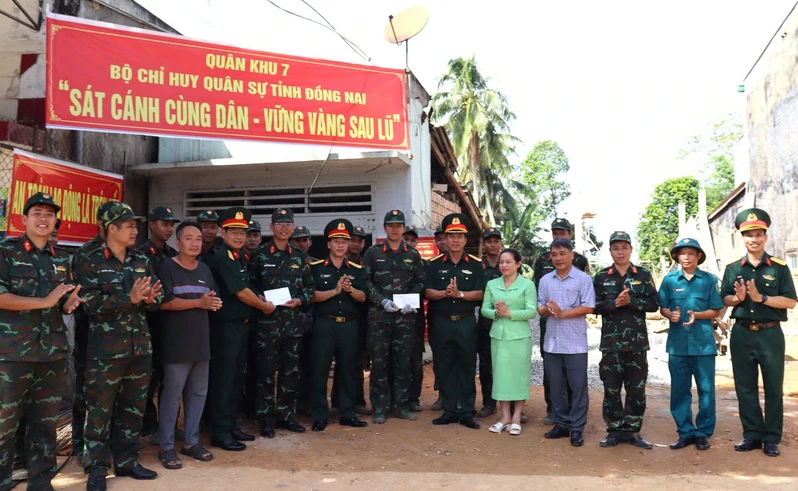 Thủ trưởng Bộ CHQS tỉnh Đồng Nai, các cơ quan Bộ chỉ huy và chính quyền địa phương động viên lực lượng xây dựng nhà cho người dân.