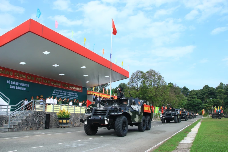 Khối xe Thiết giáp biểu dương sức mạnh tại lễ ra quân huấn luyện Bộ CHQS tỉnh Đồng Nai năm 2026.