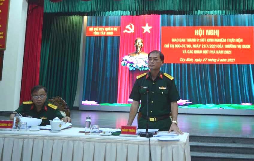 (QK7 Online) - Ngày 27/8, Bộ CHQS tỉnh Tây Ninh tổ chức hội nghị rút kinh nghiệm thực hiện Chỉ thị số 660-CT/TW, ngày 21/7/2021 của Thường vụ Đảng ủy Quân khu 7 về việc mở chiến dịch cao điểm giúp dân vượt qua khó khăn do đại dịch Covid-19 và các khâu đột phá của LLVT tỉnh trong năm 2021. Đại tá Ngô Thành Đồng, Chỉ huy trưởng Bộ CHQS tỉnh chủ trì hội nghị.