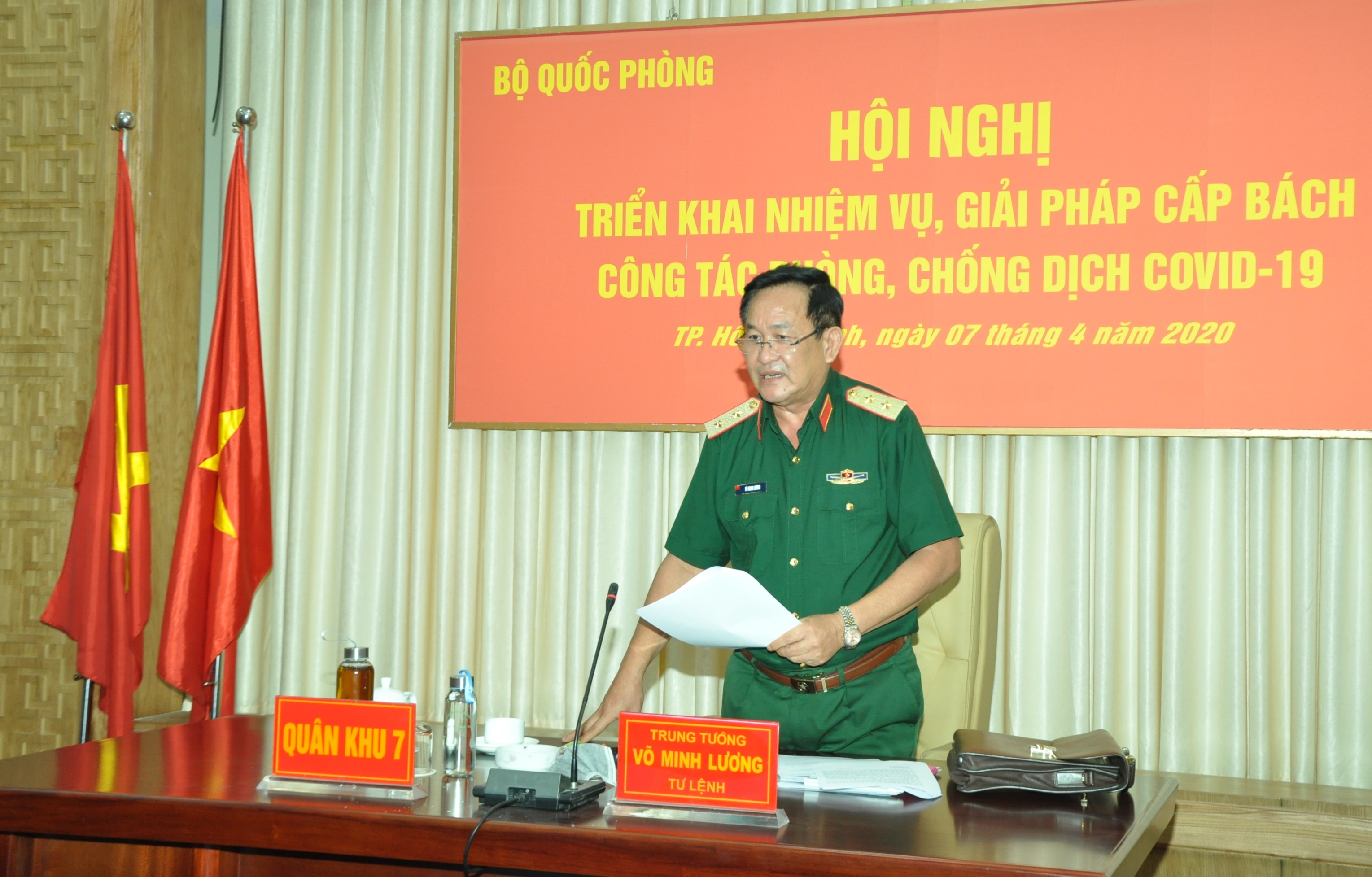 Tại điểm cầu Bộ Tư lệnh Quân khu 7, Trung tướng Võ Minh Lương, Ủy viên Trung ương Đảng, Tư lệnh Quân khu 7 chủ trì hội nghị.