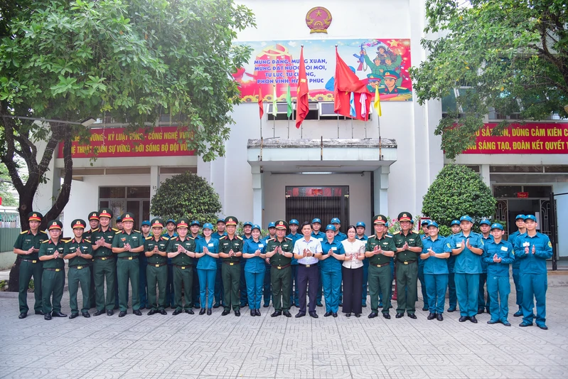 Trung tướng Nguyễn Bá Lực cùng đoàn công tác với cán bộ, chiến sĩ Ban Chỉ huy quân sự phường Trấn Biên.