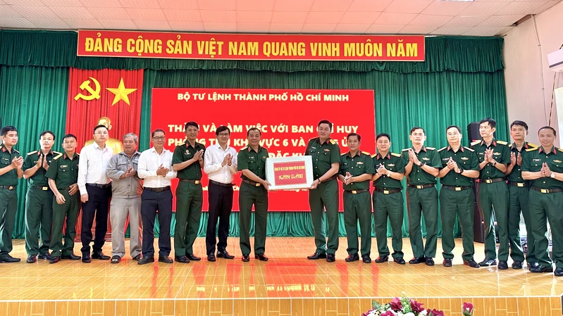 Thiếu tướng Vũ Văn Điền, Tư lệnh Bộ Tư lệnh TPHCM tặng quà cho Ban chỉ huy Phòng thủ khu vực 6 - Đặc khu Côn Đảo.