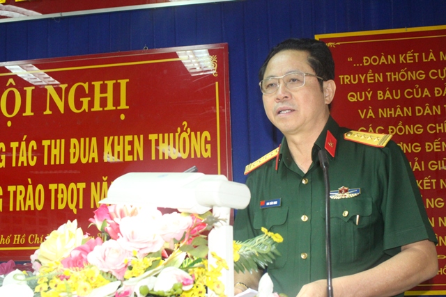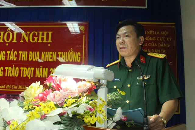 Đại tá Trịnh Văn Tám - Phó Tổng Giám đốc công ty Đông Hải báo cáo kết quả phong trào thi đua Quyết thắng