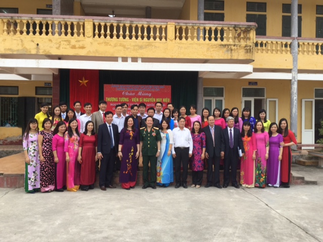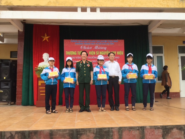 Thượng tướng - Viện sỹ Nguyễn Huy Hiệu tặng quà cho các cháu học sinh trường THCS Đào Sư Tích, huyện Trực Ninh, Nam Định
