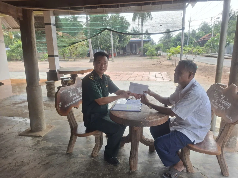 Dịp này, Chỉ huy Đồn đã đến thăm, động viên, tặng quà cho ông Danh Ngất, người dân tộc Khơ - me có uy tín trên địa bàn ấp Kà Ốt được lựa chọn tham dự Chương trình gặp mặt già làng, trưởng ấp, người có uy tín, chức sắc tôn giáo tại Thành phố Cần Thơ diễn ra vào các ngày 17, 18/4/2026 do Tổng Cục Chính trị QĐND Việt Nam tổ chức.