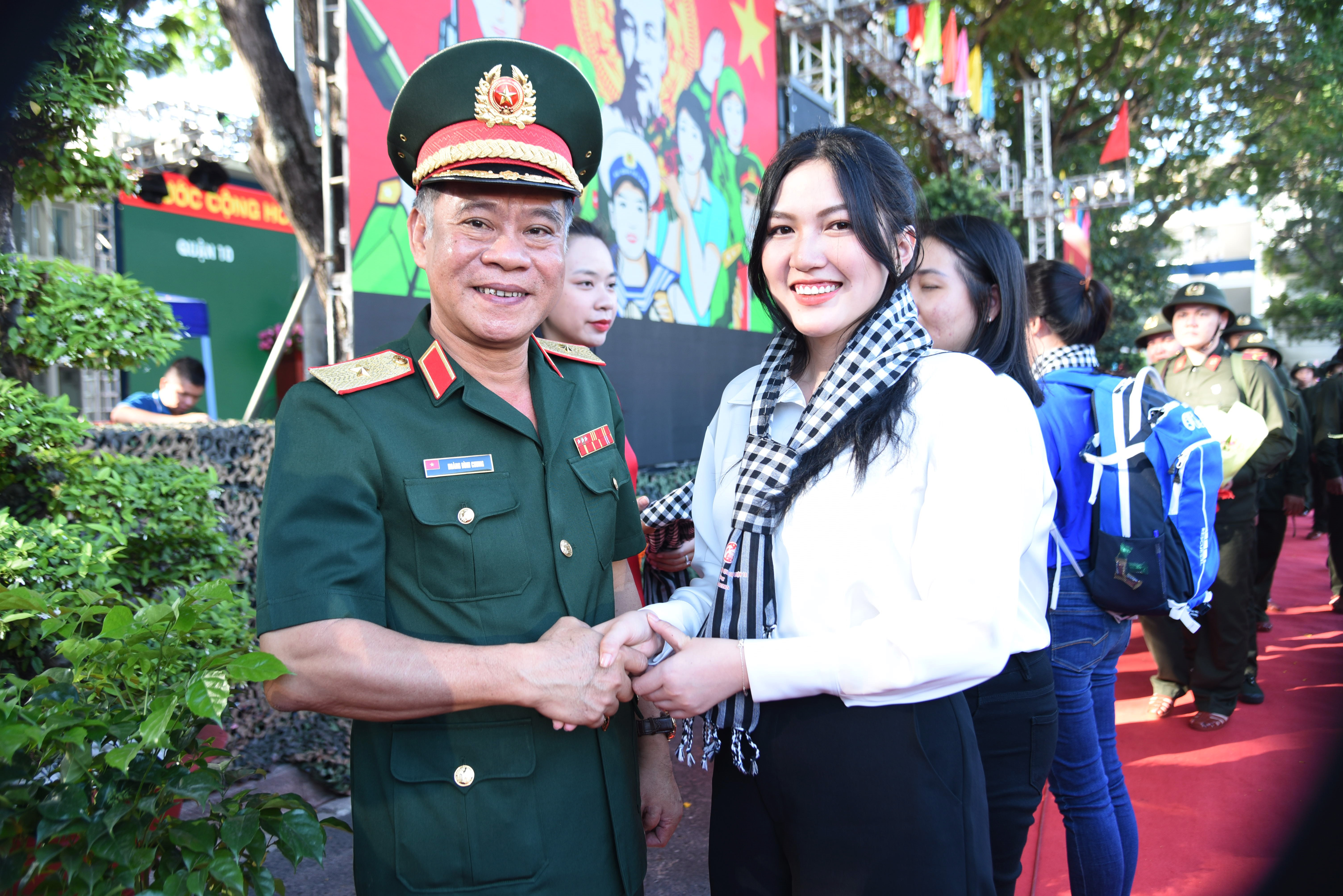 Thiếu tướng Hoàng Đình Chung, Chủ nhiệm Chính trị Quân khu chúc mừng nữ thanh niên trúng tuyển nghĩa vụ quân sự lên đường bảo vệ Tổ quốc.