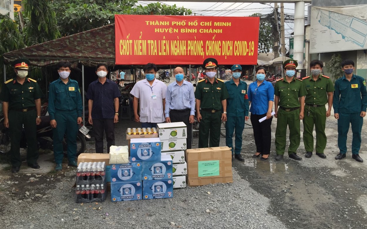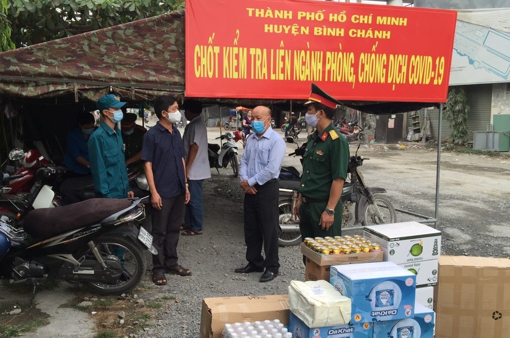 Đồng chí Nguyễn Văn Phụng – Bí thư Huyện ủy huyện Bình Chánh (thứ 2 từ bên phải) động viên lực lượng làm nhiệm vụ tại chốt kiểm tra liên ngành phòng, chống dịch Covid-19.