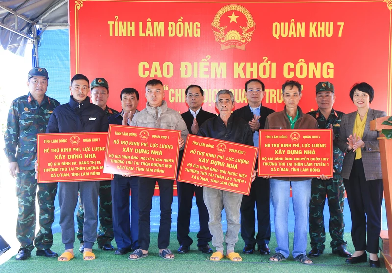 Đồng chí Bùi Thanh Sơn, Ủy viên Ban Chấp hành Trung ương Đảng, Phó Thủ tướng Chính phủ và các đồng chí lãnh đạo tỉnh Lâm Đồng, thủ trưởng các cơ quan Quân khu 7 trao tặng bảng tượng trưng hỗ trợ xây nhà cho các hộ gia đình xã D' ran, tỉnh Lâm Đồng.