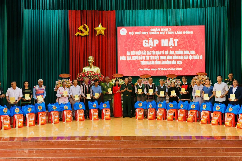 Thiếu tướng Đặng Văn Lẫm, Phó Tư lệnh Quân khu và lãnh đạo Ủy ban MTTQ Việt Nam tỉnh Lâm Đồng tặng quà các đại biểu chức sắc các tôn giáo và già làng, trưởng thôn, bon, buôn, người có uy tín tiêu biểu trong vùng đồng bào dân tộc thiểu số trên địa bàn tỉnh Lâm Đồng.