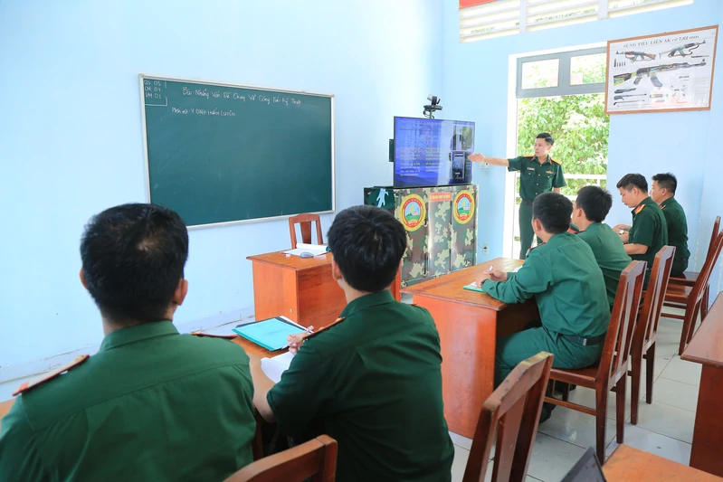 Cán bộ Trung đội tổ chức giáo dục chính trị cho bộ đội thông qua bài giảng điện tử.