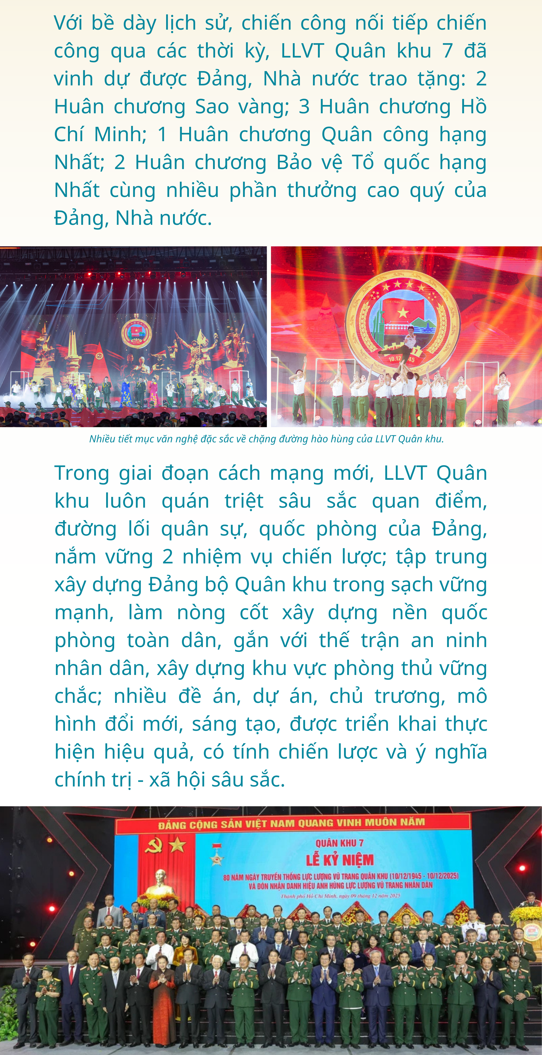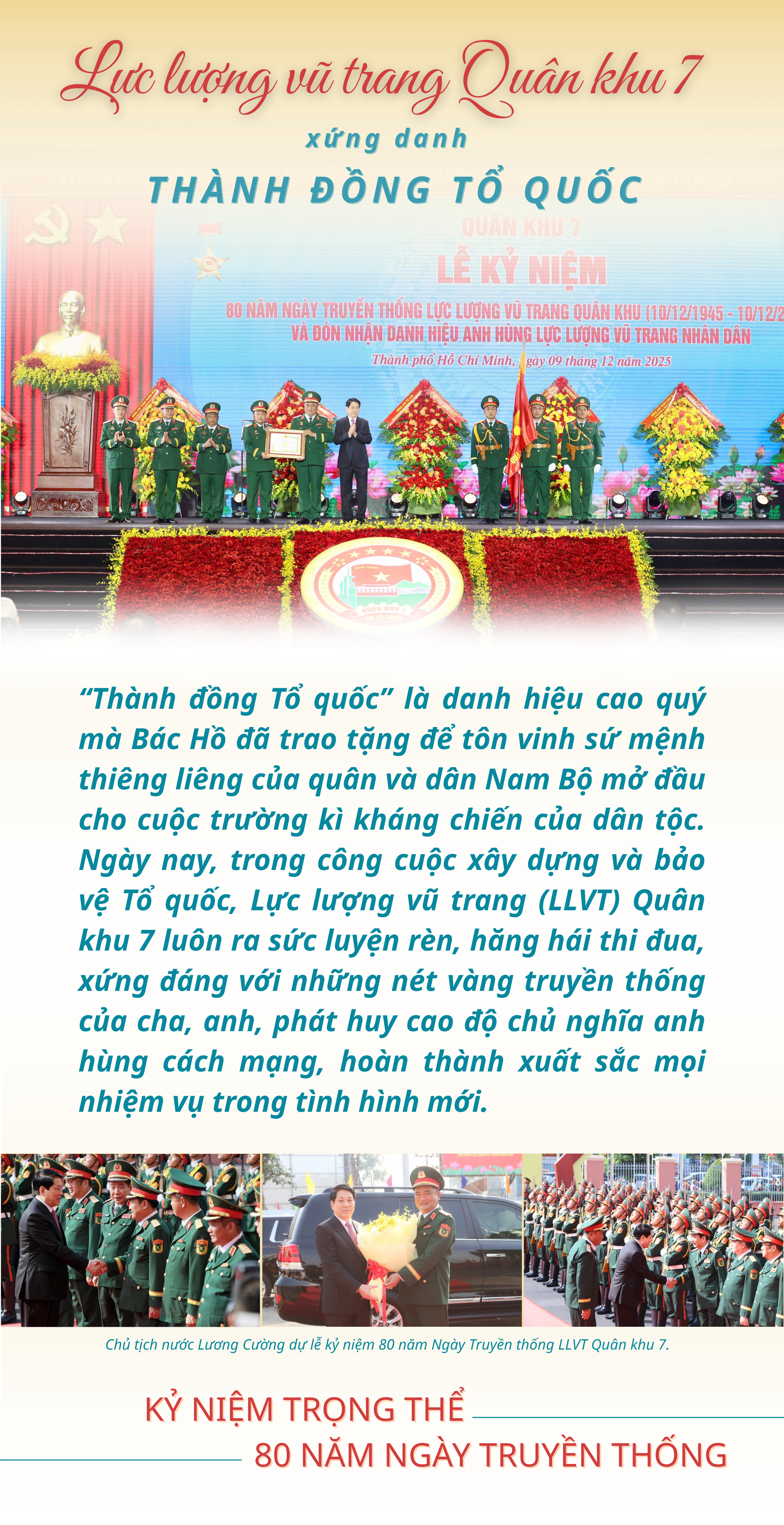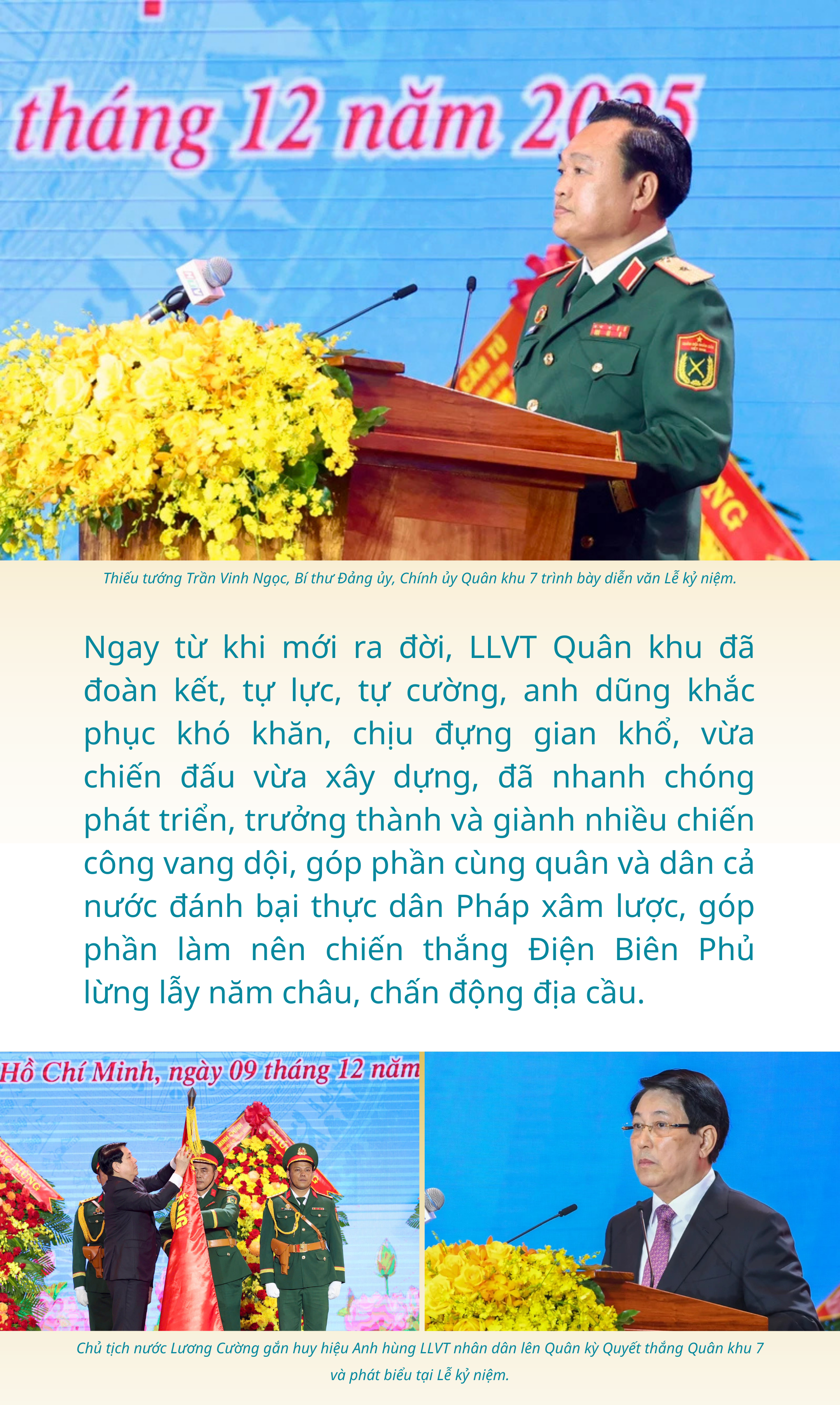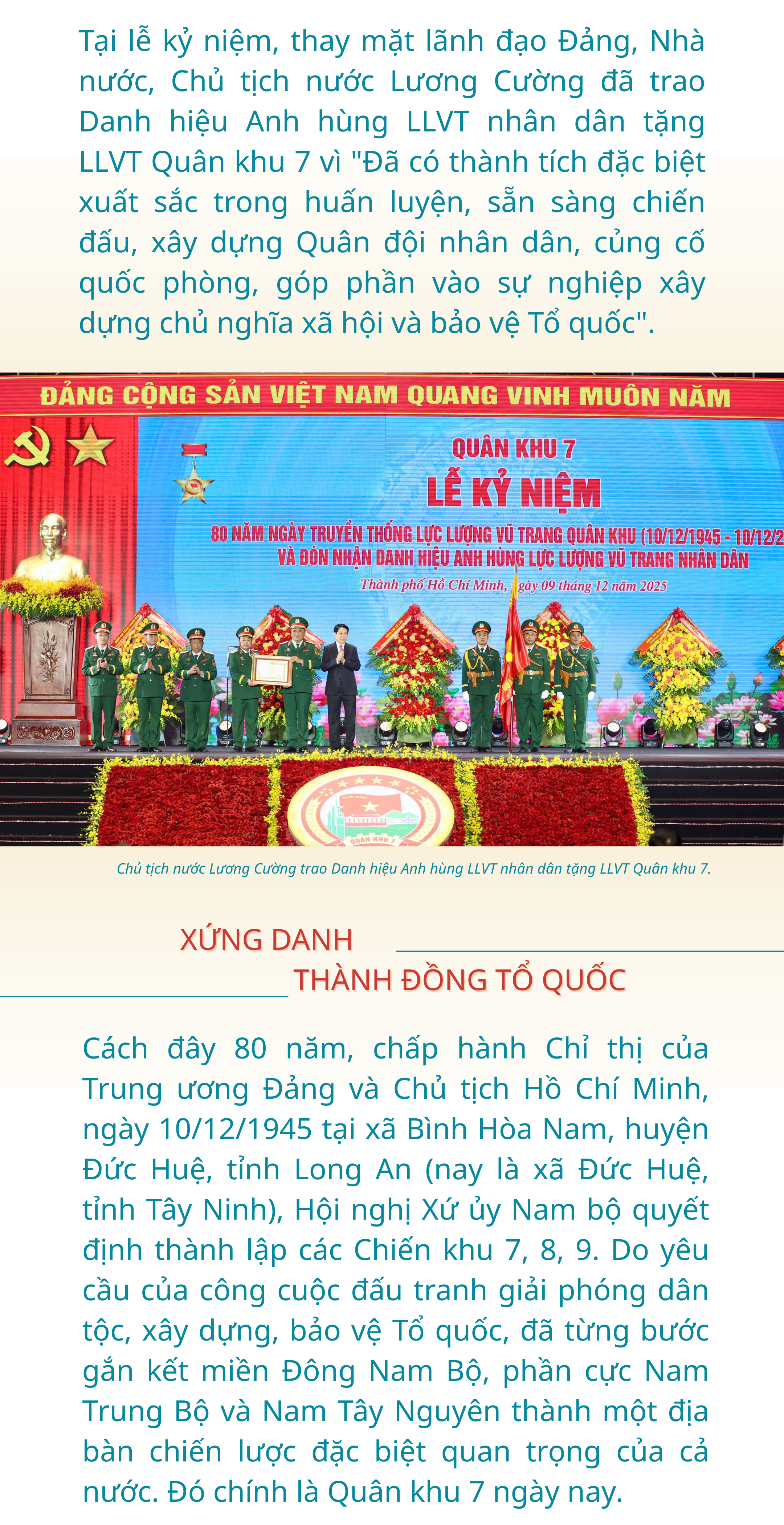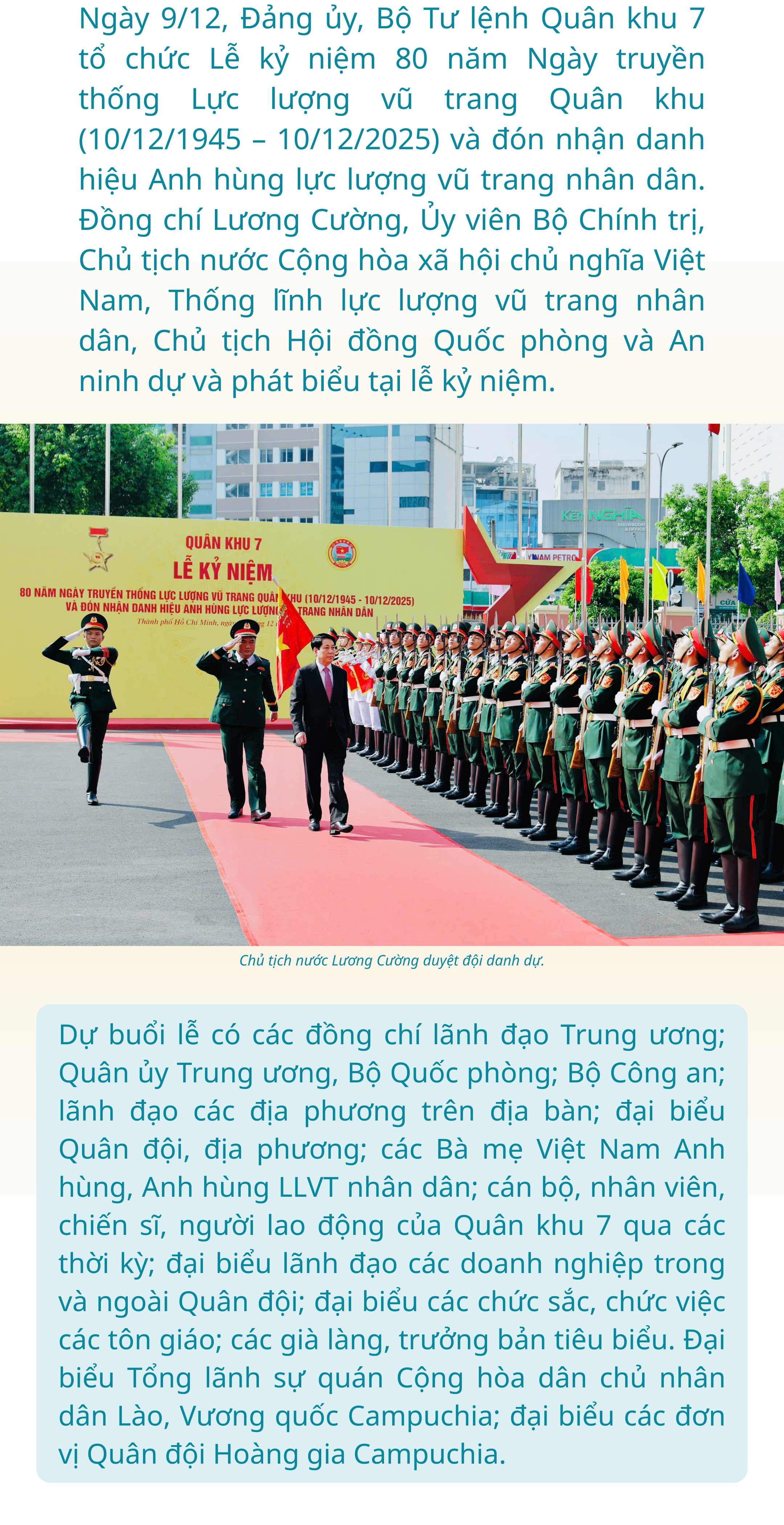 (QK7 Online) – Sáng ngày 9/12, Đảng ủy, Bộ Tư lệnh Quân khu 7 tổ chức Lễ kỷ niệm 80 năm Ngày truyền thống LLVT Quân khu (10/12/1945 – 10/12/2025) và đón nhận danh hiệu Anh hùng lực lượng vũ trang nhân dân. Đồng chí Lương Cường, Ủy viên Bộ Chính trị, Chủ tịch nước Cộng hòa xã hội chủ nghĩa Việt Nam, thống lĩnh LLVT nhân dân, Chủ tịch Hội đồng Quốc phòng và An ninh dự và phát biểu tại lễ kỷ niệm.