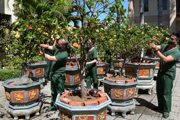 Chiến sĩ mới Tiểu đoàn 3, Trung đoàn Gia Định chăm sóc cảnh quan môi trường trong giờ nghỉ..