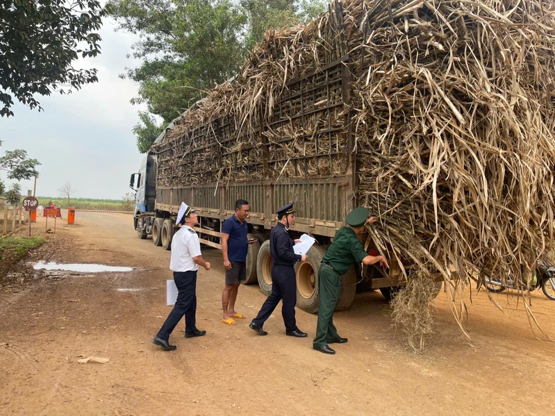Các lực lượng kiểm tra hàng hóa xuất, nhập cảnh tại Trạm kiểm soát Biên phòng Kà Tum.
