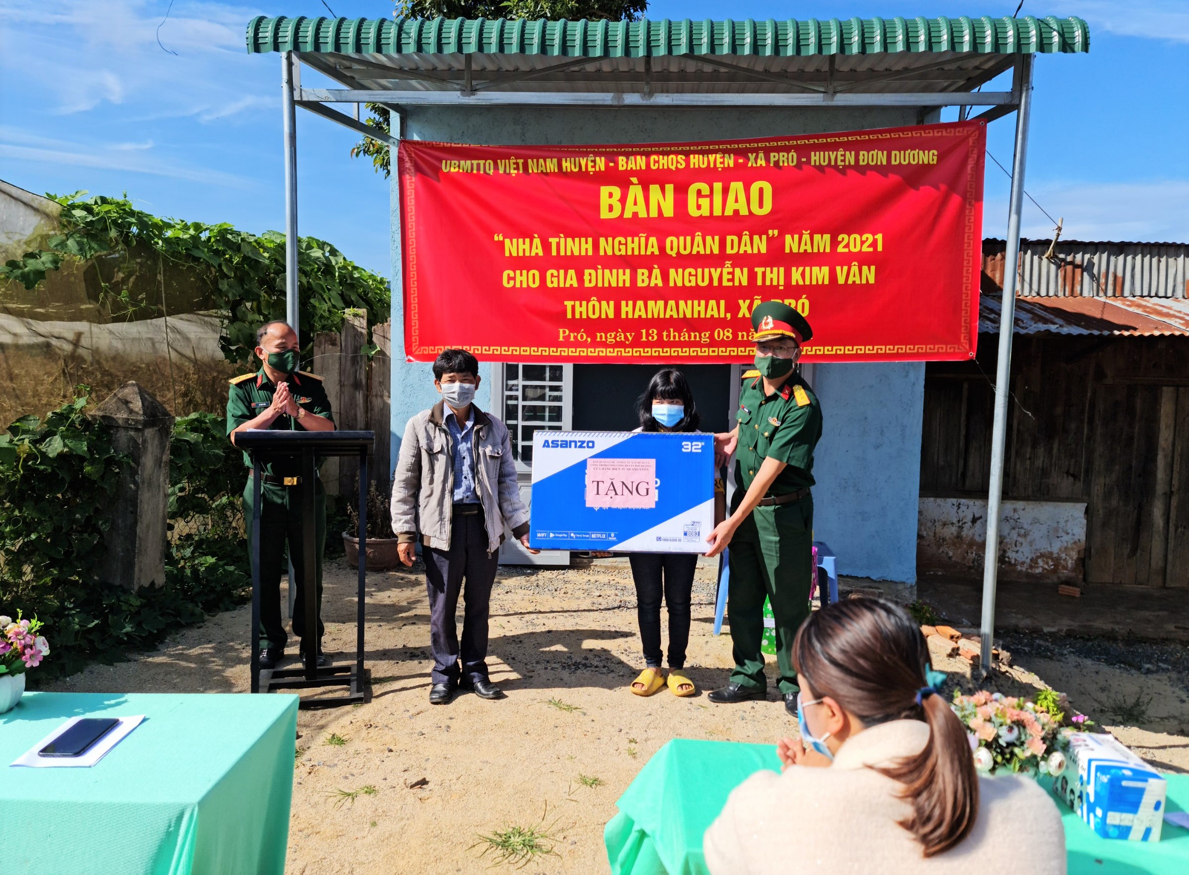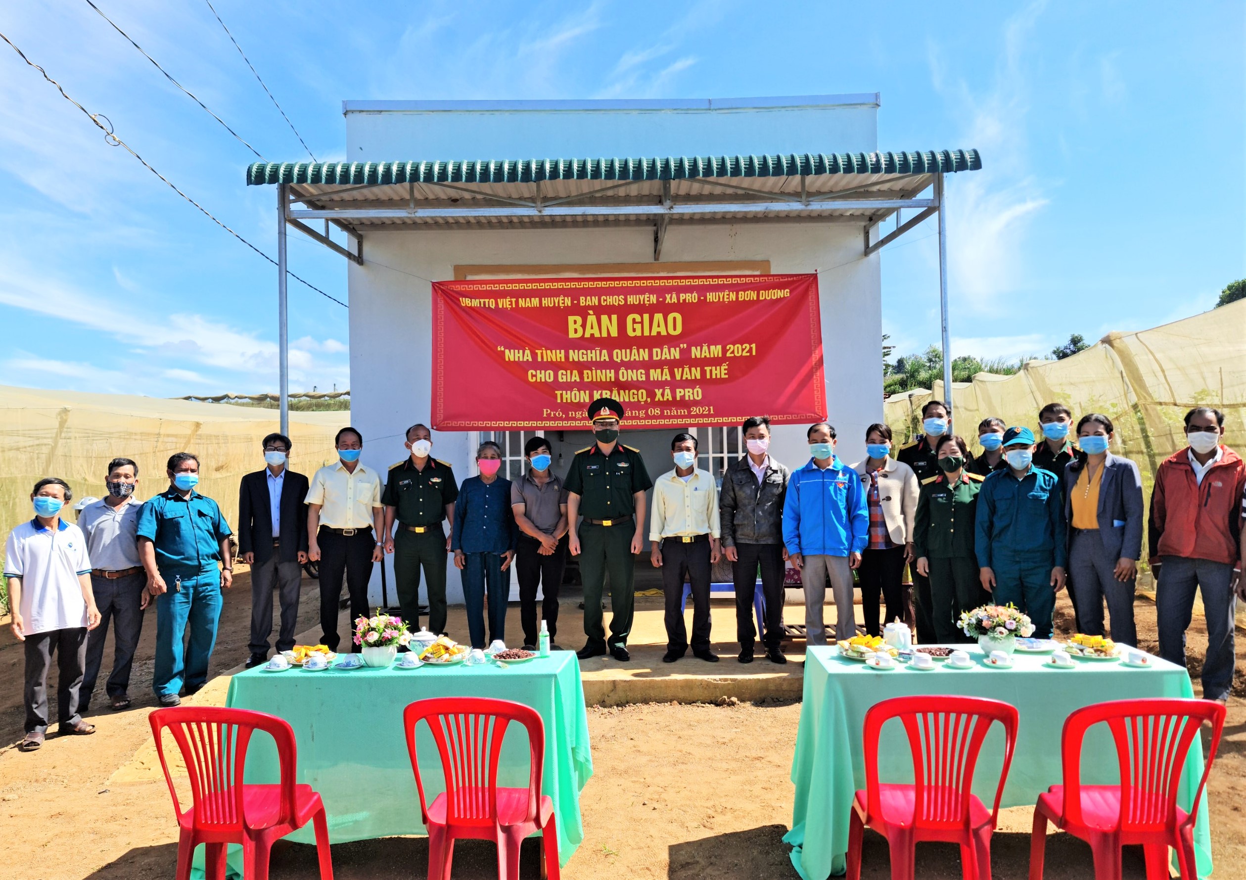 Ngoài ra, Ban chỉ huy Quân sự huyện và xã Pró đã vận động các doanh nghiệp, cá nhân trên địa bàn ủng hộ thêm vật liệu xây dựng gồm gạch, cát, đá, sơn nước... lực lượng vũ trang huyện giúp đỡ khoảng 120 ngày công lao động. Trong ngày bàn giao, Ban CHQS huyện và các cơ quan, đoàn thể xã Pró tặng 2 gia đình một số vật dụng cần thiết như tivi, quạt máy, ấm chén...