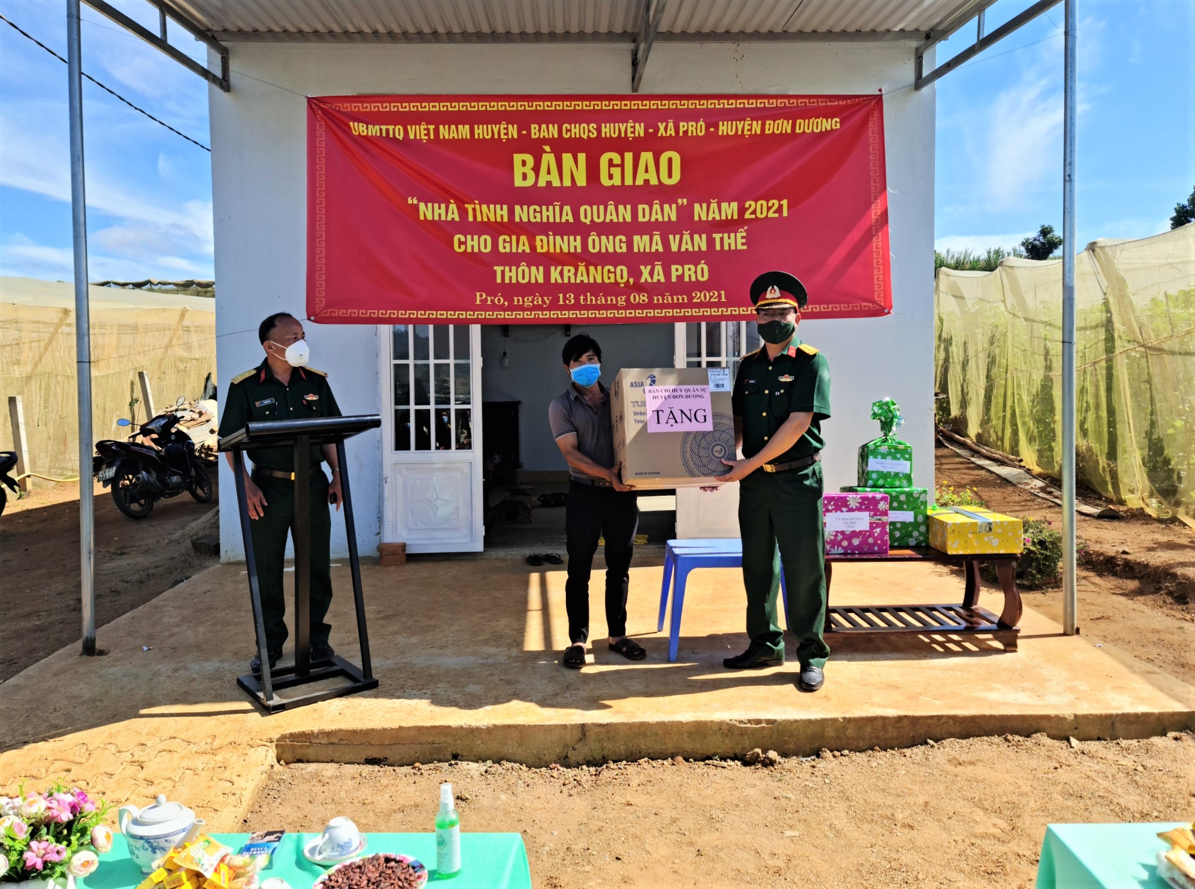 (QK7 Online) - Trong những năm qua, bằng nguồn kinh phí tăng gia sản xuất, Ban chỉ huy Quân sự huyện Đơn Dương, tỉnh Lâm Đồng phối hợp với các cơ quan, đơn vị, địa phương xây tặng cho các gia đình gặp khó khăn về nhà ở trên địa bàn. Năm nay, Ban chỉ huy Quân sự huyện tiếp tục bàn giao 2 căn nhà cho gia đình chị Nguyễn Thị Kim Vân, có con là Nguyễn Trường Vinh và gia đình anh Mã Văn Thế có con là Mã Văn Dũng, đều là chiến sĩ nhập ngũ năm 2021, hiện đang công tác tại Sư đoàn 5. Qua đó, giúp anh em an tâm công tác, thực hiện tốt nhiệm vụ được giao.