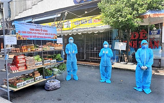 Gian hàng 0 đồng ở quận Tân Phú hỗ trợ người dân trong khu cách ly. Ảnh: Quốc Huy