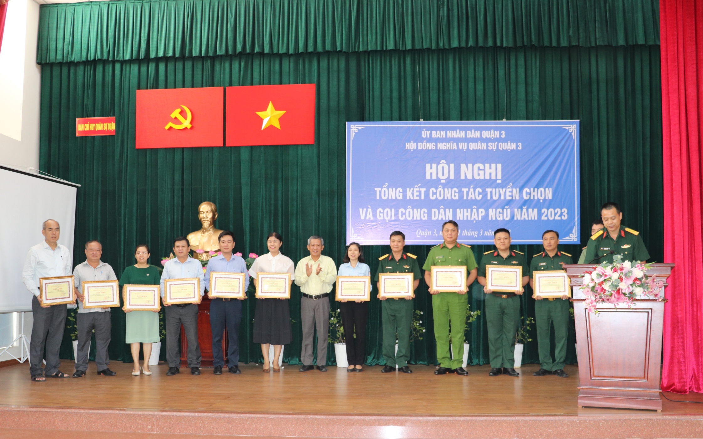 UBND Quận 3 tặng Giấy khen cho 23 tập thể, 2 gia đình và 51 cá nhân có thành tích xuất sắc trong công tác tuyển chọn và gọi công dân nhập ngũ năm 2023.