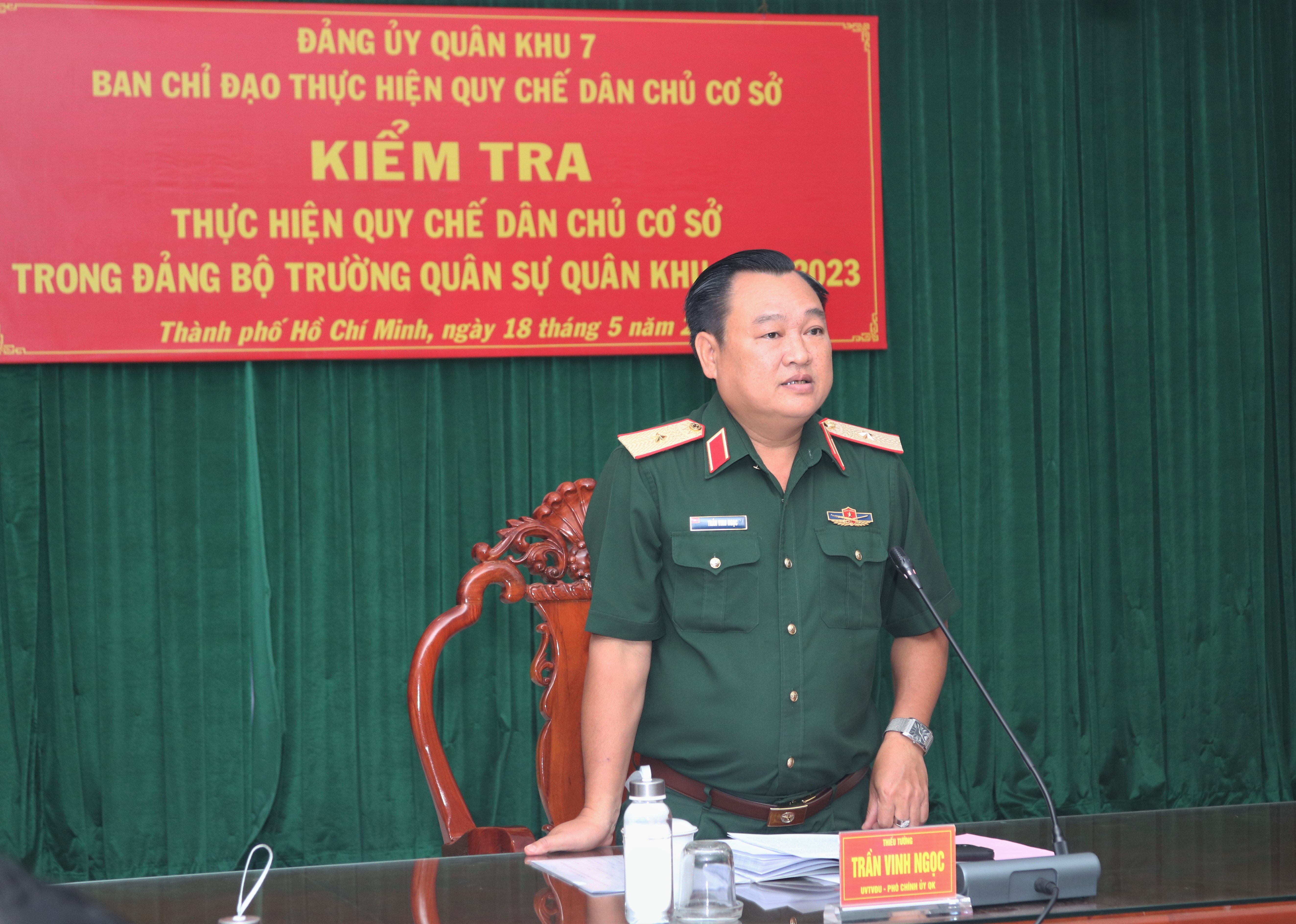Qua kiểm tra, Thiếu tướng Trần Vinh Ngọc, Phó Chính ủy Quân khu đánh giá cao kết quả thực hiện QCDCCS của Đảng ủy nhà trường thời gian qua. Đồng chí Phó Chính ủy Quân khu đề nghị Đảng ủy nhà trường, các cơ quan, đơn vị tiếp thu các ý kiến đóng góp của thành viên đoàn công tác, kịp thời điều chỉnh những hạn chế, thiếu sót còn tồn tại.