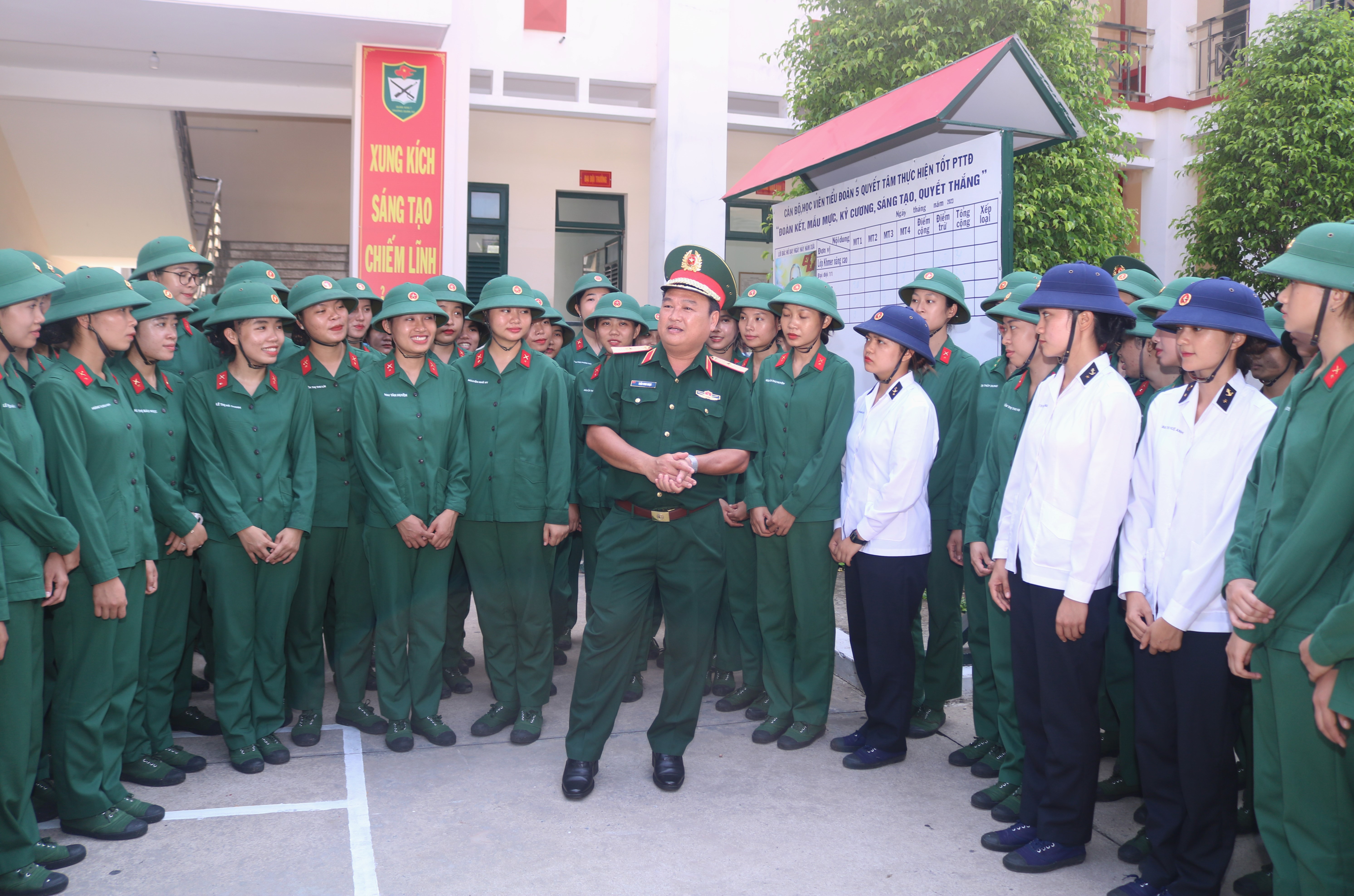 Thiếu tướng Trần Vinh Ngọc, Phó Chính ủy Quân khu đến thăm, động viên các chiến sĩ nữ ở Đại đội 12, Tiểu đoàn 5.