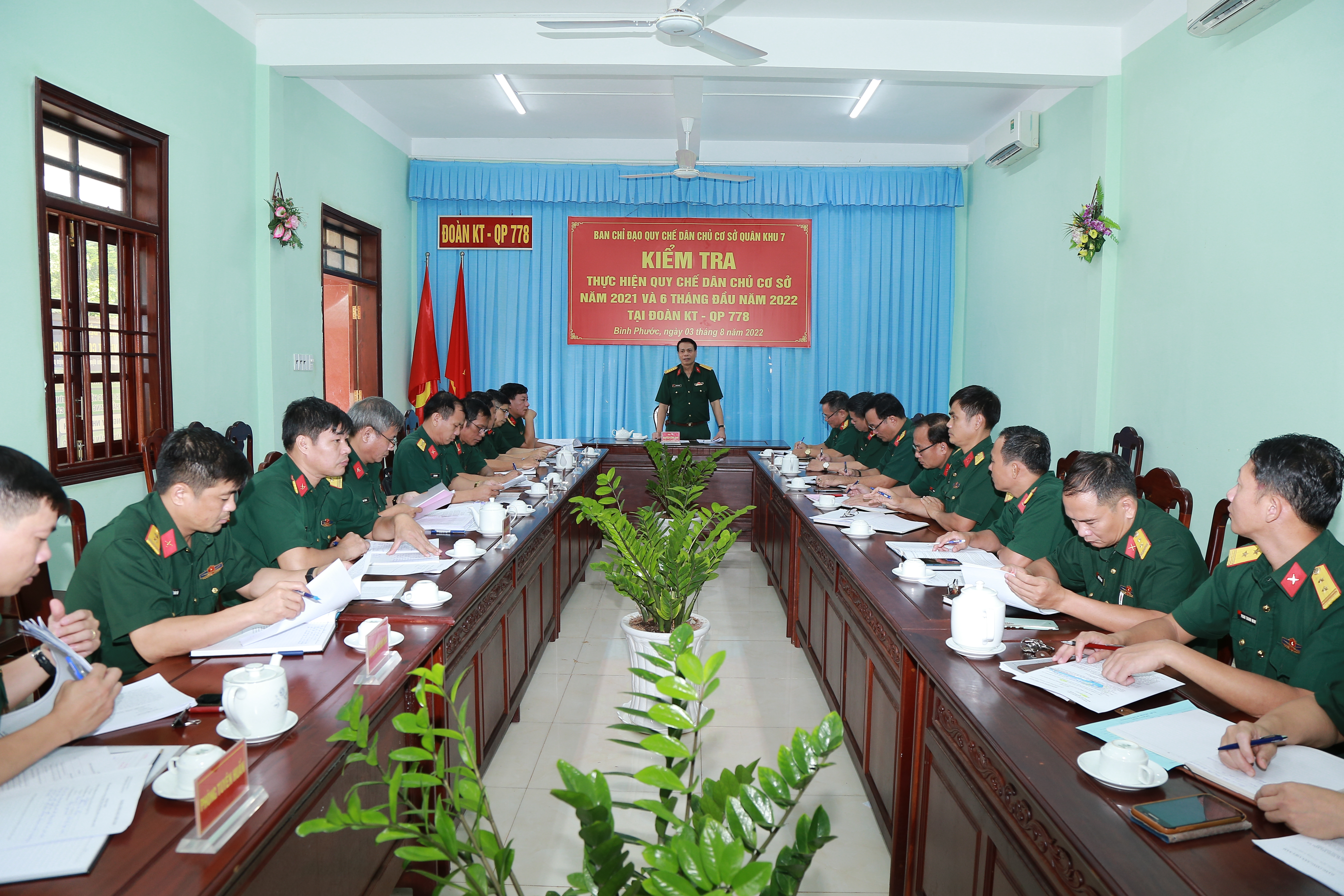 (QK7 Online) - Ngày 3/8, đoàn công tác Ban chỉ đạo thực hiện Quy chế dân chủ cơ sở (QCDCCS) Đảng ủy Quân khu 7 do Đại tá Nguyễn Công Anh, Phó Chủ nhiệm Chính trị Quân khu, Phó Trưởng Ban thường trực Ban chỉ đạo thực hiện QCDCCS Đảng ủy Quân khu làm trưởng đoàn đến kiểm tra việc thực hiện QCDCCS trong Đảng bộ Đoàn Kinh tế - Quốc phòng (KTQP) 778.