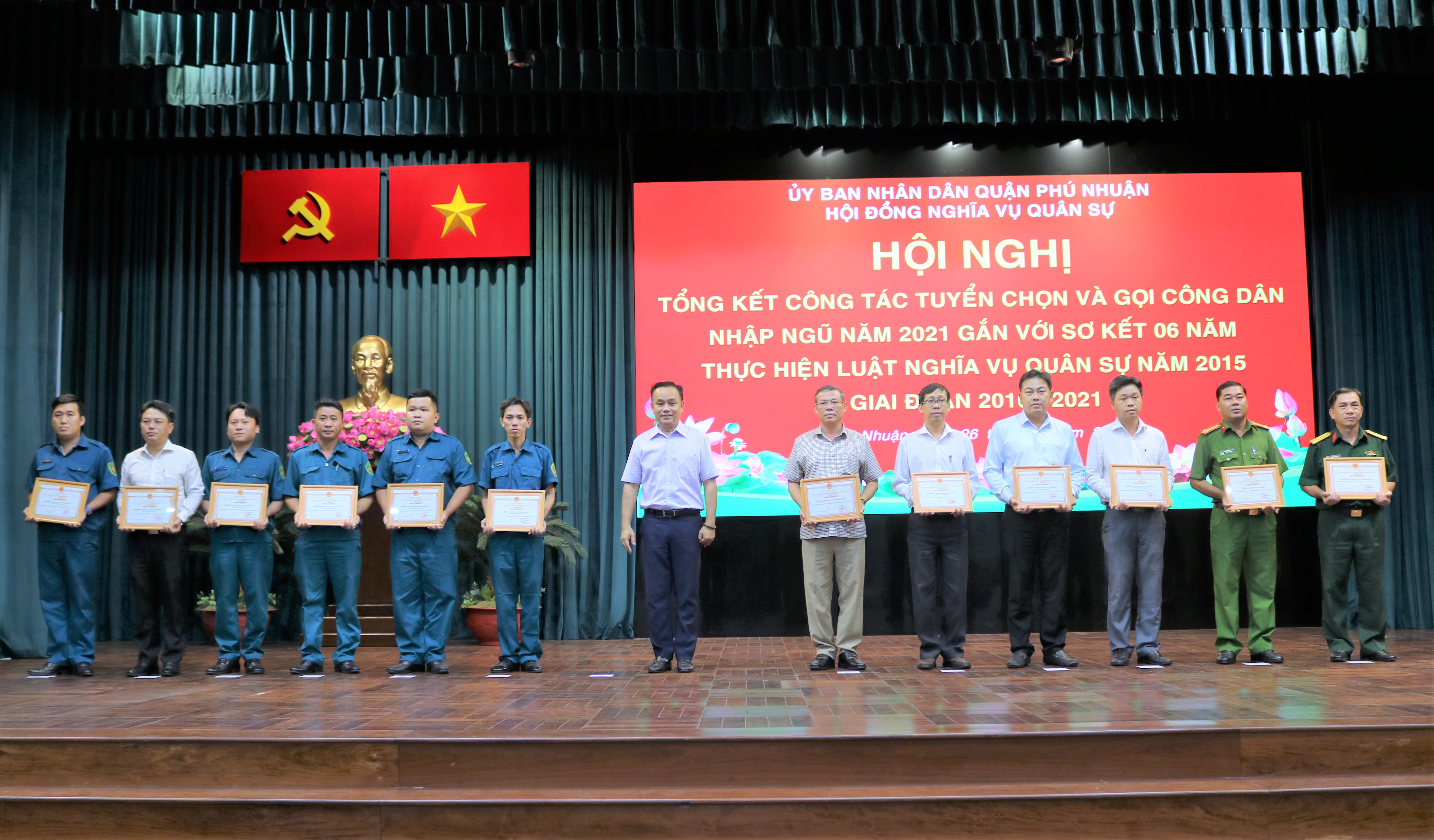 Tại hội nghị, UBND quận đã tổ chức sơ kết 6 năm thực hiện Luật nghĩa vụ quân sự năm 2015 giai đoạn 2016-2021. Dịp này, đại diện UBND quận đã tặng bằng khen cho 25 tập thể và 46 cá nhân có thành tích xuất sắc trong công tác tuyển chọn và gọi công dân nhập ngũ năm 2021 và 9 tập thể thực hiện tốt Luật nghĩa vụ quân sự năm 2015 giai đoạn 2015-2021.