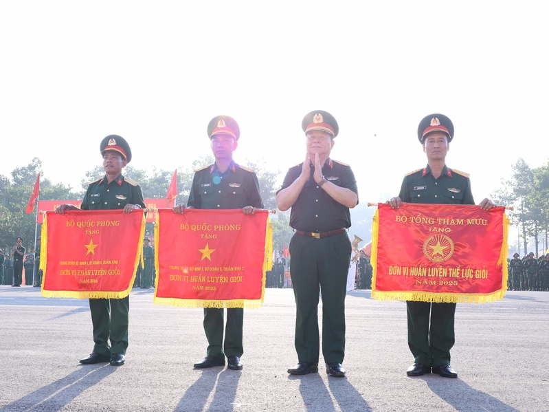 Đại tướng Nguyễn Trọng Nghĩa, Ủy viên Bộ Chính trị, Bí thư Trung ương Đảng, Ủy viên Thường vụ QUTW, Chủ nhiệm Tổng cục Chính trị Quân đội Nhân dân Việt Nam trao cờ “Đơn vị huấn luyện giỏi” và "Đơn vị huấn luyện thể lực giỏi” năm 2025.