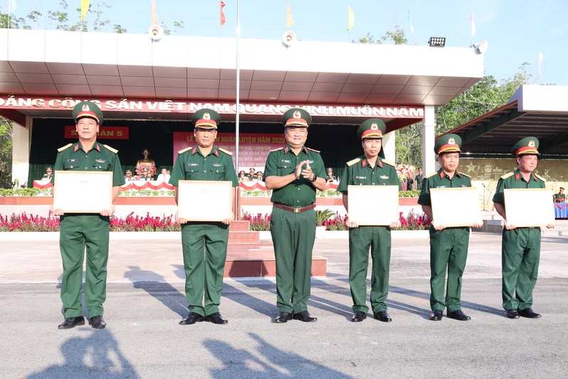 Dịp này, Trung đoàn 4, Trung đoàn 5 vinh dự nhận Cờ của Bộ Quốc phòng “Đơn vị huấn luyện giỏi” năm 2025; Trung đoàn 4 nhận cờ của Bộ Tổng Tham mưu “Đơn vị huấn luyện thể lực giỏi” năm 2025; Phòng Tham mưu, Phòng Chính trị, Phòng Hậu cần - Kỹ thuật và Trung đoàn 4, Trung đoàn 5 được Tư lệnh Quân khu 7 khen thưởng Đơn vị vững mạnh toàn diện “mẫu mực, tiêu biểu” năm 2025.