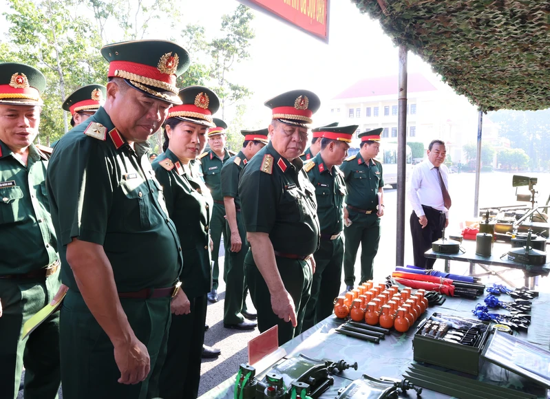 Đại tướng Nguyễn Trọng Nghĩa, Ủy viên Bộ Chính trị, Bí thư Trung ương Đảng, Ủy viên Thường vụ QUTW, Chủ nhiệm Tổng cục Chính trị Quân đội Nhân dân Việt Nam cùng đại biểu tham quan mô hình, học cụ huấn luyện của Sư đoàn.