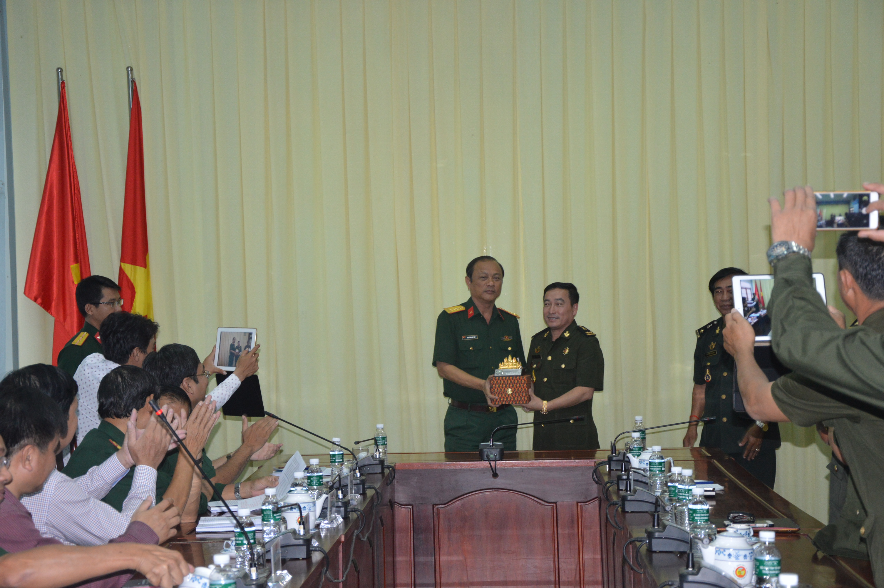 Trung tướng YoongMao – Phó cục trưởng Cục phát triển Bộ Quốc phòng, Quân đội Hoàng gia Campuchia tặng quà lưu niệm cho Đại tá Nguyễn Văn Trứ - Chỉ huy trưởng Bộ Chỉ huy quân sự tỉnh Tây Ninh