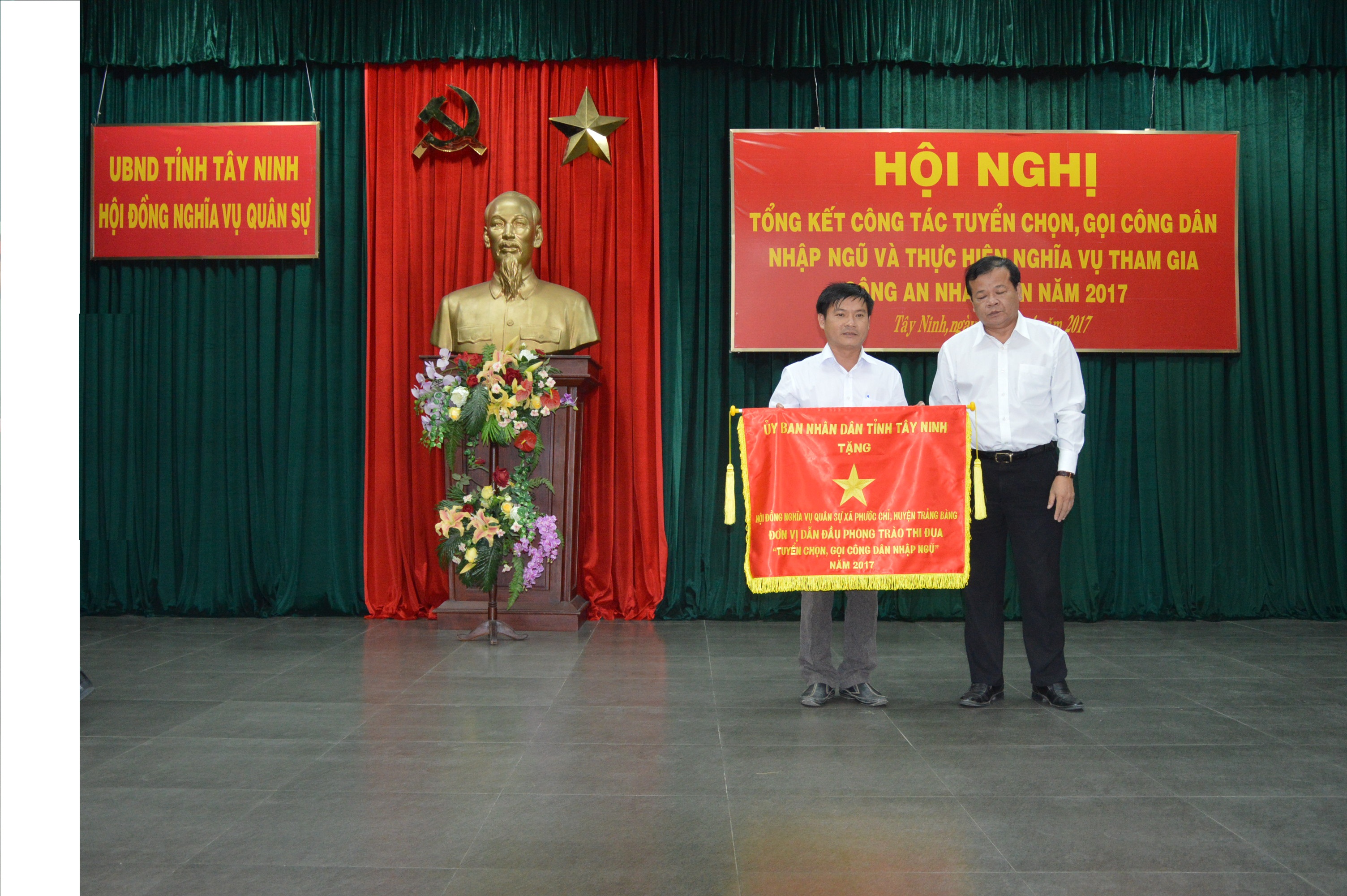 Đồng Phạm Văn Tân - Phó Bí thư Tỉnh ủy, Chủ tịch UBND, Chủ tịch Hội đồng nghĩa vụ quân sự tỉnh Tây Ninh trao cờ thưởng đơn vị xuất sắc cho Hội đồng nghĩa vụ quân sự xã Phước Chỉ, huyện Trảng Bàng