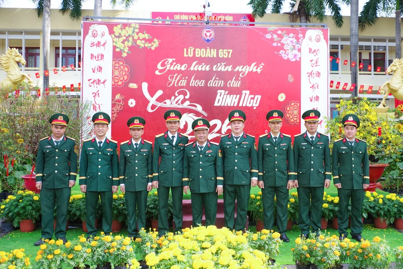 Thiếu tướng Trần Chí Tâm, Ủy viên Ban Thường vụ Đảng ủy, Phó Chính ủy Quân khu 7 cùng đoàn công tác chụp hình lưu niệm với Chỉ huy Lữ đoàn 657.