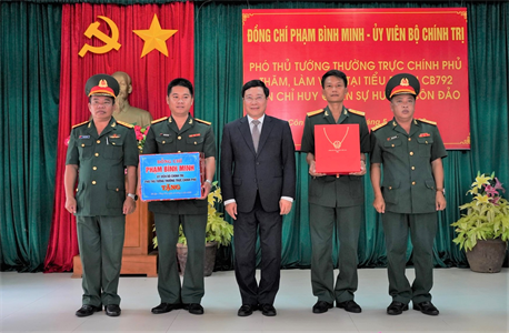 Đồng chí Phạm Bình Minh, Ủy viên Bộ Chính trị, Phó Thủ tướng Thường trực Chính phủ thăm, tặng quà động viên cán bộ, chiến sĩ Tiểu đoàn Công binh 792 trong chuyến công tác tại Côn Đảo tháng 5/2022.