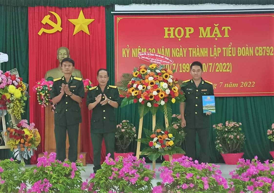 Thủ trưởng Bộ CHQS tỉnh Bà Rịa - Vũng Tàu tặng hoa chúc mừng Tiểu đoàn Công binh 792 tại buổi họp mặt kỷ niệm 30 năm Ngày Thành lập đơn vị.