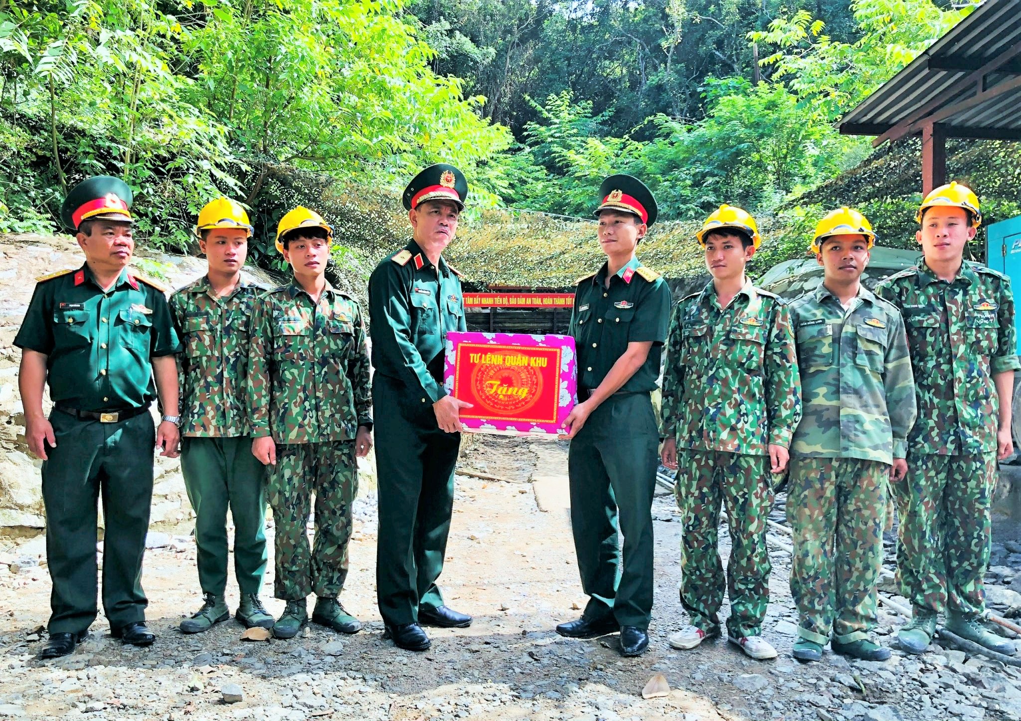 Thiếu tướng Nguyễn Trường Thắng, Ủy viên Trung ương Đảng, Tư lệnh Quân khu 7 tặng quà động viên cán bộ, chiến sĩ Tiểu đoàn Công binh 792 thi công công trình phòng thủ.