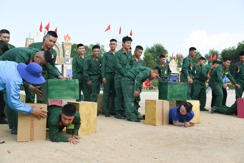 Đông đảo thanh niên chuẩn bị lên đường nhập ngũ hăng hái tham gia các trò chơi.