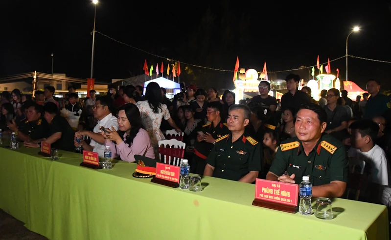 Từ phải qua: Đại tá Phùng Thế Hùng, Phó Tham mưu trưởng Quân khu; Đại tá Nguyễn Văn Sơn, Chính ủy Bộ CHQS tỉnh Lâm Đồng cùng lãnh đạo cấp ủy, chính quyền địa phương dự hội trại.