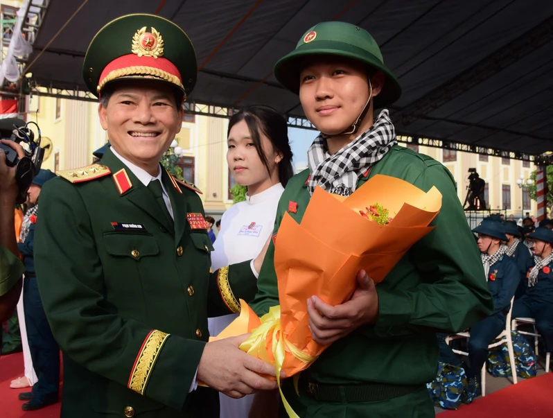 Thượng tướng Phạm Trường Sơn tặng hoa chúc mừng thanh niên lên đường nhập ngũ.