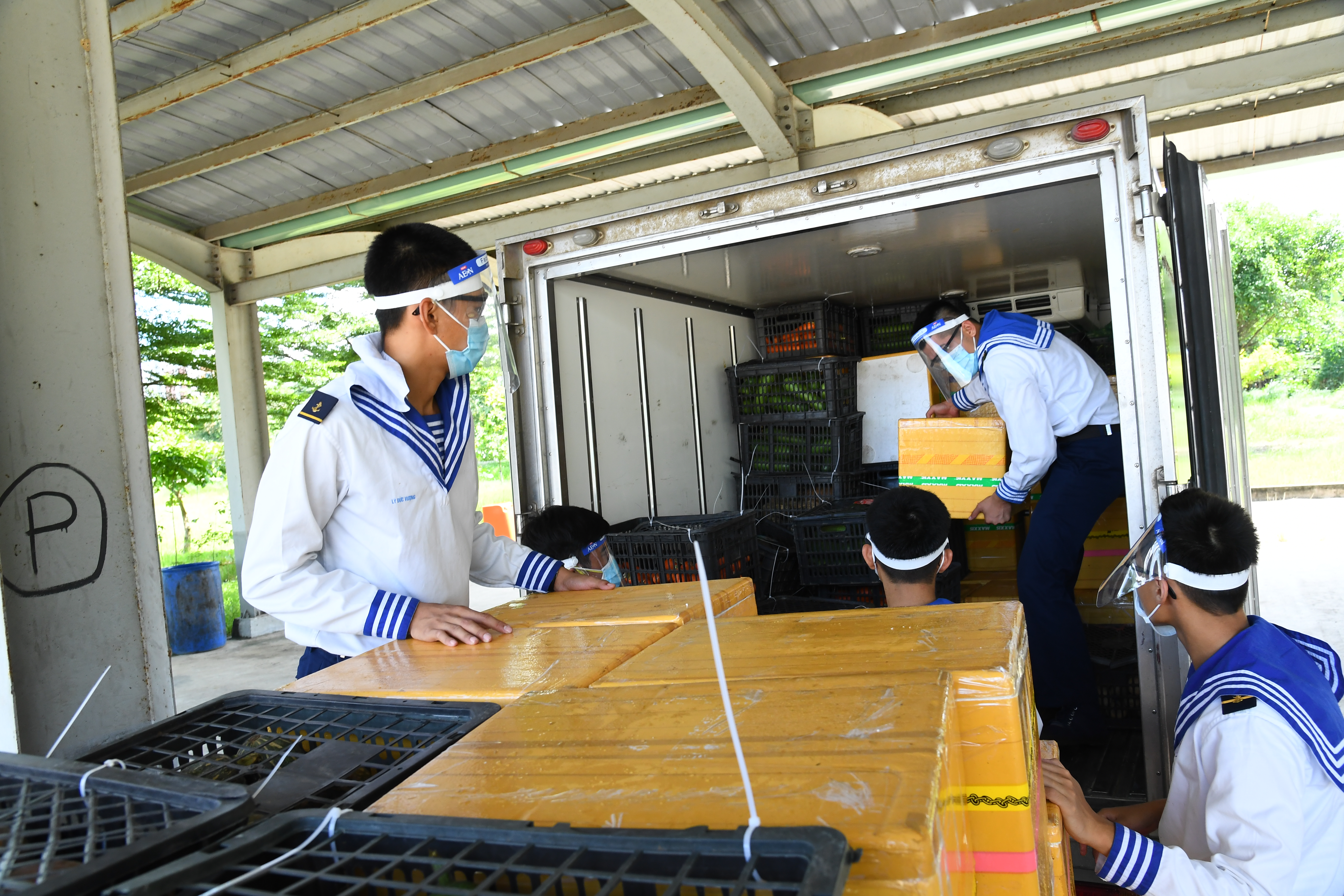 Cán bộ, chiến sĩ Vùng 2 Hải quân chuyển thực phẩm vào khu chế biến bữa ăn của Bệnh viện Dã chiến thu dung điều trị Covid -19 số 1.